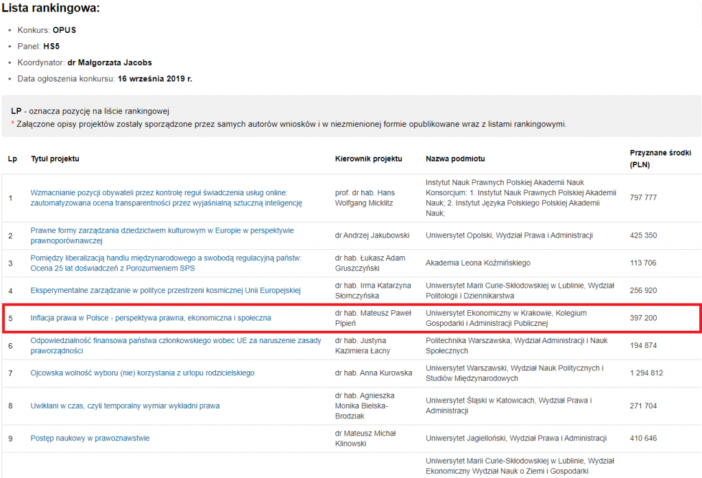 Serdecznie gratulacje dla prof. UEK dr hab. Mateusza Pipienia za otrzymanie grantu NCN – OPUS 18.  Tytuł projektu znalazł się na wysokim – 5 – miejscu spośród wszystkich 18.