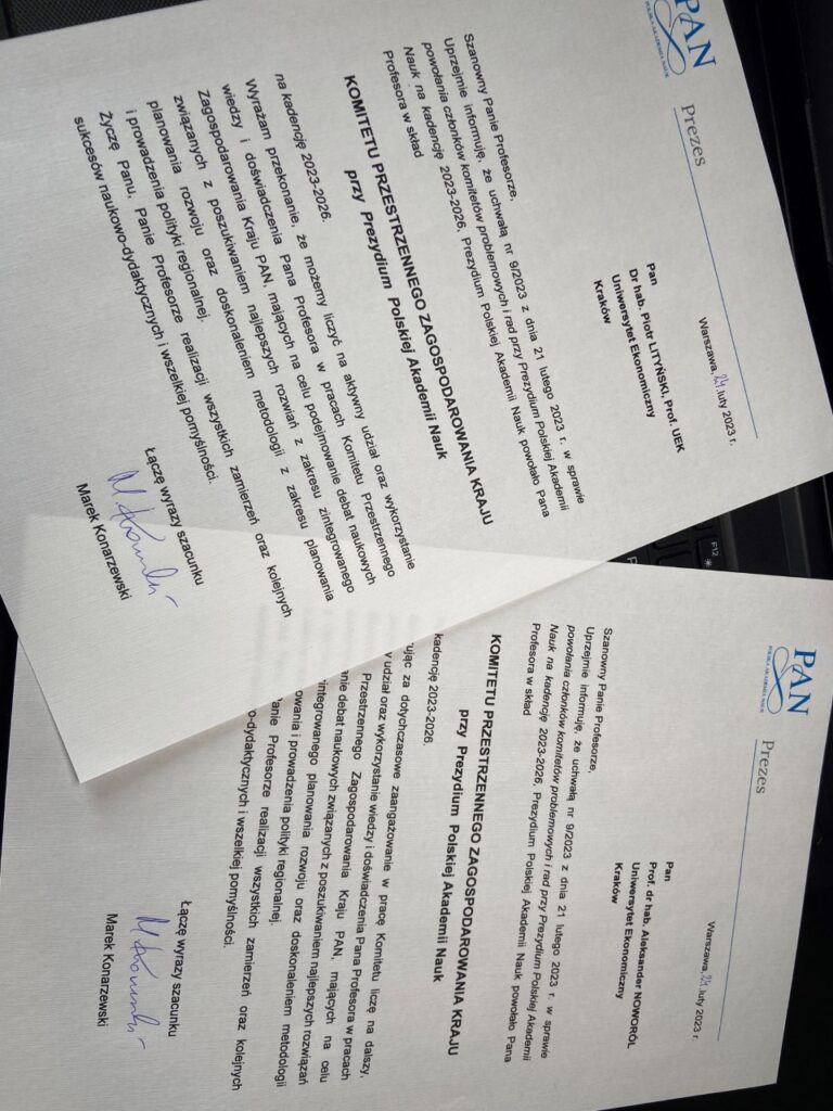 Miło nam poinformować, iż w dniu 28 lutego 2023 r. w Pałacu Staszica w Warszawie odbyła się uroczystość nominowania członków Komitetu Przestrzennego Zagospodarowania Kraju PAN. W kadencji 2023-2026 członkami Komitetu zostali: prof. dr hab. inż. arch. Aleksander Noworól oraz dr hab. Piotr Lityński, prof. UEK. Obaj profesorowie zatrudnieni są w Katedrze Gospodarki Przestrzennej.