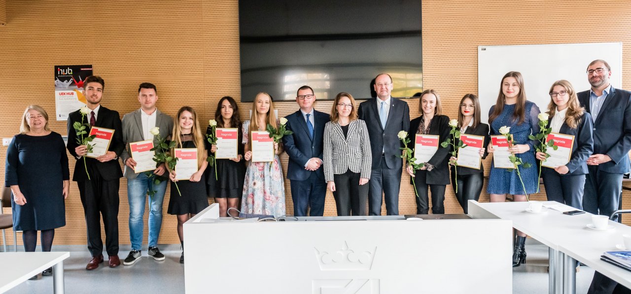 Nagrody wręczyli dr hab. Karolina Klecha-Tylec, prof. UEK, Prorektor ds. Kształcenia i Studentów, dr hab. Piotr Buła, prof. UEK Prorektor ds. Projektów i Współpracy oraz Wojciech Leśniewski, Dyrektor Santander Universidades w Polsce.