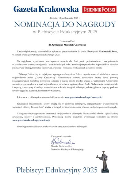 Z przyjemnością informujemy, że dr Agnieszka Mazurek-Czarnecka została nominowana przez studentów do tytułu Nauczyciel Akademicki Roku w ramach Plebiscytu Edukacyjnego 2025, organizowanego przez Gazetę Krakowską i Dziennik Polski